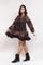 Vestido manga larga con puños, de escote pico con tirantes para anudar y bolero en ruedo, elaborado en tejido plano liviano con elongación y estampación digital de tacto suave.