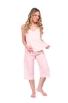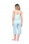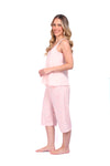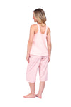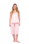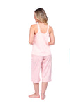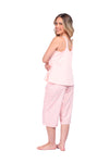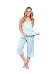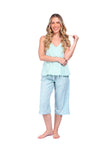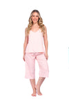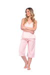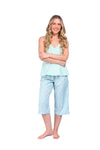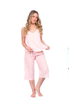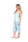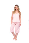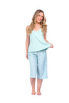 Blusa unicolor sisa con cargaderas anchas de silueta recta; Capri elaborado en tejido de punto, efecto satín, de tacto frío y extra suave con estampación digital. Cinta decorativa en cintura