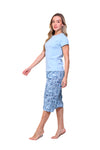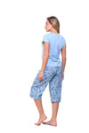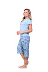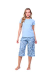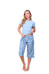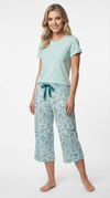 Blusa unicolor manga corta con bolsillo; capri elaborado en tejido plano liviano con elongación y estampación digital de tacto suave, con cinta decorativa en cintura