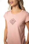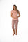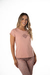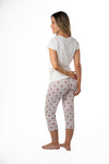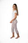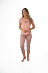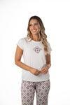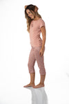 Blusa unicolor manga corta con estampado localizado; capri en tela piel de durazno con estampación digital de tacto extra suave. Cinta decorativa en cintura de short.