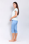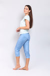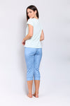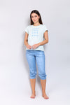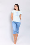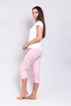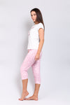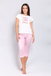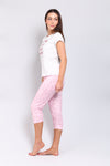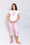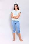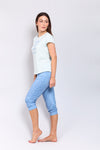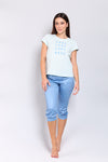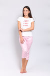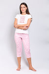 Con un diseño práctico y femenino, esta pijama combina una blusa unicolor de cuello redondo con un capri suave y liviano que se adapta a tu ritmo. El estampado sutil y los bolsillos funcionales suman estilo y comodidad, haciendo de este set tu aliado favorito para descansar con libertad y frescura.