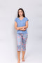 Con un diseño práctico y femenino, esta pijama combina una blusa unicolor de cuello redondo con un capri suave y liviano que se adapta a tu ritmo. El estampado sutil y los bolsillos funcionales suman estilo y comodidad, haciendo de este set tu aliado favorito para descansar con libertad y frescura.