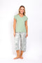 Con un diseño práctico y femenino, esta pijama combina una blusa unicolor de cuello redondo con un capri suave y liviano que se adapta a tu ritmo. El estampado sutil y los bolsillos funcionales suman estilo y comodidad, haciendo de este set tu aliado favorito para descansar con libertad y frescura.
