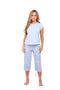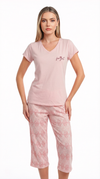 Blusa unicolor manga corta cuello "v" con estampado localizado punto corazón; capri elaborado en tela con fibras de algodón, de tacto suave con estampación digital