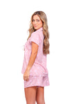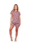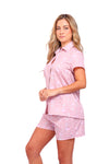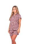 Set de short elaborado en tejido plano liviano con textura diagonal y estampación digital; blusa camisera manga corta con perilla y botones.