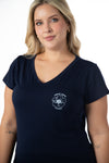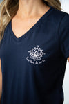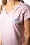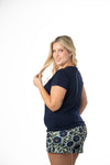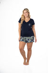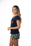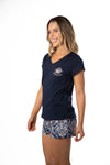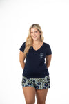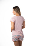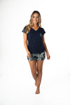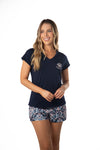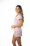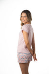 blusa unicolor manga corta cuello "v" con estampado localizado punto corazón. short en tela de microfibra liviana, de tacto suave con estampación digital