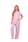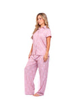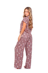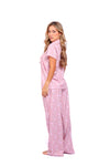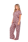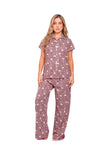 Set de pantalón elaborado en tejido plano liviano con textura diagonal y estampación digital; blusa camisera manga corta con perilla y botones.