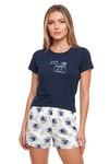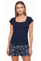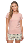 Blusa unicolor manga corta con estampado localizado; short en tela piel de durazno con estampación digital de tacto extra suave.
