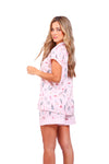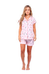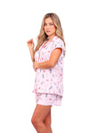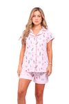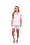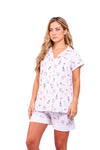 Set elaborado en tejido plano liviano con textura diagonal y estampación digital; blusa manga corta con solapa de cierre abotonado y detalle de vivo en contraste en cuello, perillas y puños; short con detalle de botas en contraste