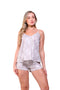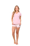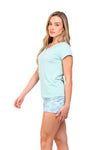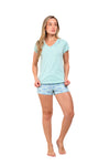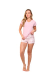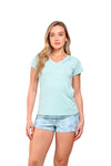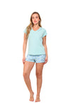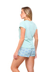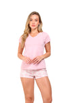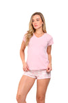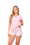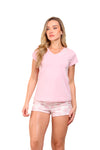 Blusa unicolor manga corta cuello "v" con estampado localizado en borde de escote; short en tela piel de durazno con estampación digital de tacto extra suave.