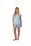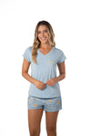Blusa unicolor manga corta cuello "v" con estampado localizado punto corazón. Short en tela de microfibra liviana, de tacto suave con estampación digital