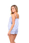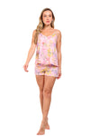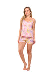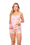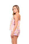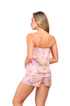 Set de short elaborado en tejido plano liviano con textura diagonal y estampación digital; blusa de silueta amplia con cargaderas graduables, short con borla decorativa en cintura. Scrunshie en tela de microfibra liviana, de tacto suave con estampación digital.